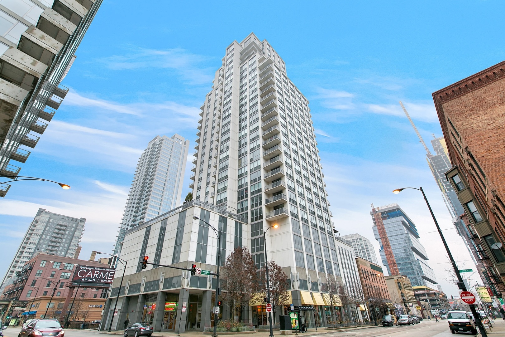 Welcome home to this fantastic southwest corner unit in perfect River North location! Excellent location close to 90/94, the brown line, red line, Merchandise Mart, parks/dog parks, Magnificent mile, the lakefront, Randolph Street restaurants, East Bank, Jewel, Whole Foods, etc. Features include floor to ceiling windows which allow tons of sunlight all day long plus gorgeous sunsets every evening, hardwood floors, oversized primary suite and ideal split floor plan, offering total privacy from both bedrooms. The open great room features a private balcony, plenty of space for living, dining, working from home and is anchored by an updated modern white kitchen with breakfast bar. The primary suite has a large custom walk in closet, separate shower, soaking tub, dual sinks and has updated lighting and mirrors. The second bedroom is located on the opposite side of the condo adjacent to the second full bathroom and laundry closet. Small foyer with a nice sized coat closet. Attached garage parking is offered at an additional $35,000. The residences are professionally managed and served by 24/7 Door staff, sundeck and gym. The monthly dues include everything, just pay a small electric bill. Heat, central air, Silver IP internet and cable are all included. Click on the 3D tour and take a look around before booking your private appointment. Don't miss out on this gem! A preferred lender offers a reduced interest rate for this listing.