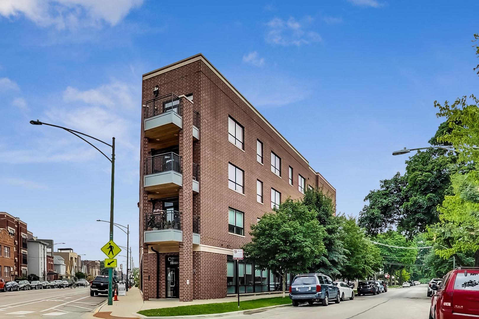 Beautiful newer construction TOP-FLOOR 3 bed/2 bath in boutique elevator building in West Lakeview/Roscoe Village. All brick construction, heated garage parking and prvt rooftop deck included. Gracious floorpan combines thoughtfully designed kitchen/dining/living complete with large west facing balcony overlooking quiet Oakley St. Tastefully designed with wide plank floors, crown molding & high-end finishes throughout. Kitchen equipped with modern flat-panel cabinetry, quartz countertops, subway tile backsplash, breakfast bar, & all SS appliances. Impressive living space w/ chic custom built-ins, gas fireplace, and plenty of room for dining. Primary suite features walk in closet with closet organization system, full en suite spa bathroom with oversized rain shower, dual vanity, and heated floors. Laundry closet with full sized front loader washer/dryer & custom shelving. Generously sized second and third bedrooms with professionally organized closets. Only 4th floor owners have prvt rooftop decks with fantastic city views. Steps away from Hamlin Park pool, dog park and tennis. Great Roscoe Village/West Lakeview location - short walk to Roscoe shops and restaurants and Lakeview/Southport corridor, 90 Mile Cuban Cafe, Hexe Coffee, Metropolitan Brewing, Mariano's, public transportation and expressway, grocery, coffee shops and more!