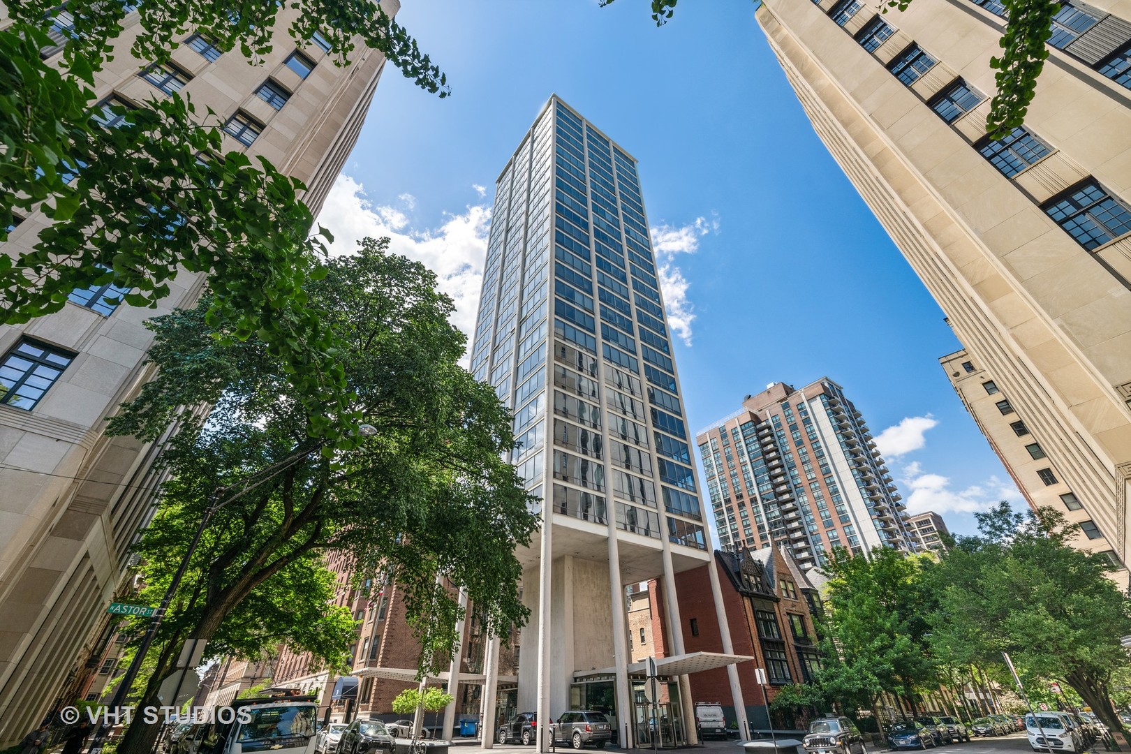 Trophy half floor oasis on tony Astor Street! Bertrand Goldberg's iconic Astor Tower is located in the prime pocket of the Gold Coast, just steps from the lakefront, Lake Shore Drive and Oak Street and nestled amongst the multimillion-dollar grey- and brownstones. This ASID-worthy home is a mid-century modernist's dream complete with sleek and sophisticated finishes throughout and expertly re-imagined in 2016. Floor-to-ceiling windows showcase the glorious corner views overlooking Lake Michigan, Goudy Park, Goethe and all the historic architecture that lines the Gold Coast. Every update conceivable including a chic Italian chef's kitchen replete with pristine lacquer cabinets, Miele wall oven, Gaggenau electric cooktop, custom stainless countertop and a commercial refrigerator that is as much art as function. The art lovers gallery leads to the second bedroom/office which shines with its full wall of custom bookcases, Murphy bed and walk-in closet. The primary bedroom occupies the entire west end of the home, bathed in warm light from the west exposure and swathed in dramatic Ripplefold draperies. The elegant marble ensuite bath boasts double Duravit sinks, two Robern medicine cabinets, and wall-mounted Duravit Phillipe Starck designed toilet. Hidden clever storage abounds in this retreat with custom sandblasted glass doors throughout and the laundry area even has a vintage glass door from the original Astor Hotel! A list of updates is available upon request. Top notch 24-hour door staff, exercise room, beauty salon, and breathtaking 360-degree rooftop deck. Deeded garage parking for an additional 50K. WELCOME HOME.
