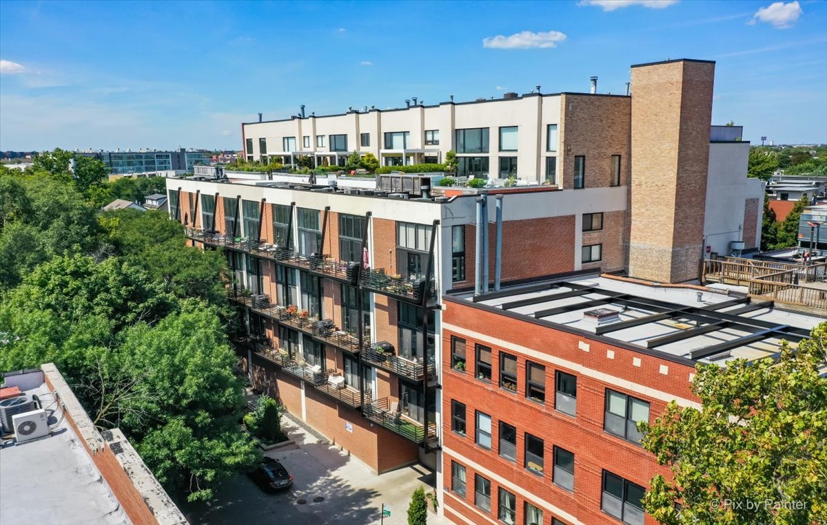 WOW - ACTUALLY A FULL 2-BEDROOM FLOORPLAN! (Listed as 1BR for MLS compliance.) Just add back a small wall and you have a spacious true 2br. Currently reimagined as a spectacular grand living space perfect for hosting & entertaining. Check out this beautiful corner unit located in the sought after Bucktown neighborhood! This gorgeous, sun-filled home offers abundant unobstructed natural light from the 15 foot, floor-to-ceiling expansive windows. The enormous living room features dark stained oak hardwood floors and soaring ceilings. The space showcases a stunning multi sided gas fireplace and opens up to the kitchen, with plenty of space for a dining room table. The oversized kitchen boasts granite countertops, sleek backsplash, ample cabinet storage, stainless steel appliances, and an eat-in island. The main floor is complimented by a private, walk out balcony, perfect for grilling or lounging. The intelligent layout splits the main suite from the reimagined 2nd bedroom in this true duplex loft. The tranquil primary suite located on the second level features a walk-in-closet and en-suite bath. In-unit laundry, plentiful storage space, bike parking, and attached heated garage parking space included. And you can't miss the shared rooftop deck with city views! The best of living in an unbeatable location. Enjoy both urban living and neighborhood charm in this incredible home that could be yours! With close proximity to the 606 trail entrance, CTA, and all shopping and restaurants that the Bucktown, Wicker Park, and Logan Square neighborhoods have to offer!