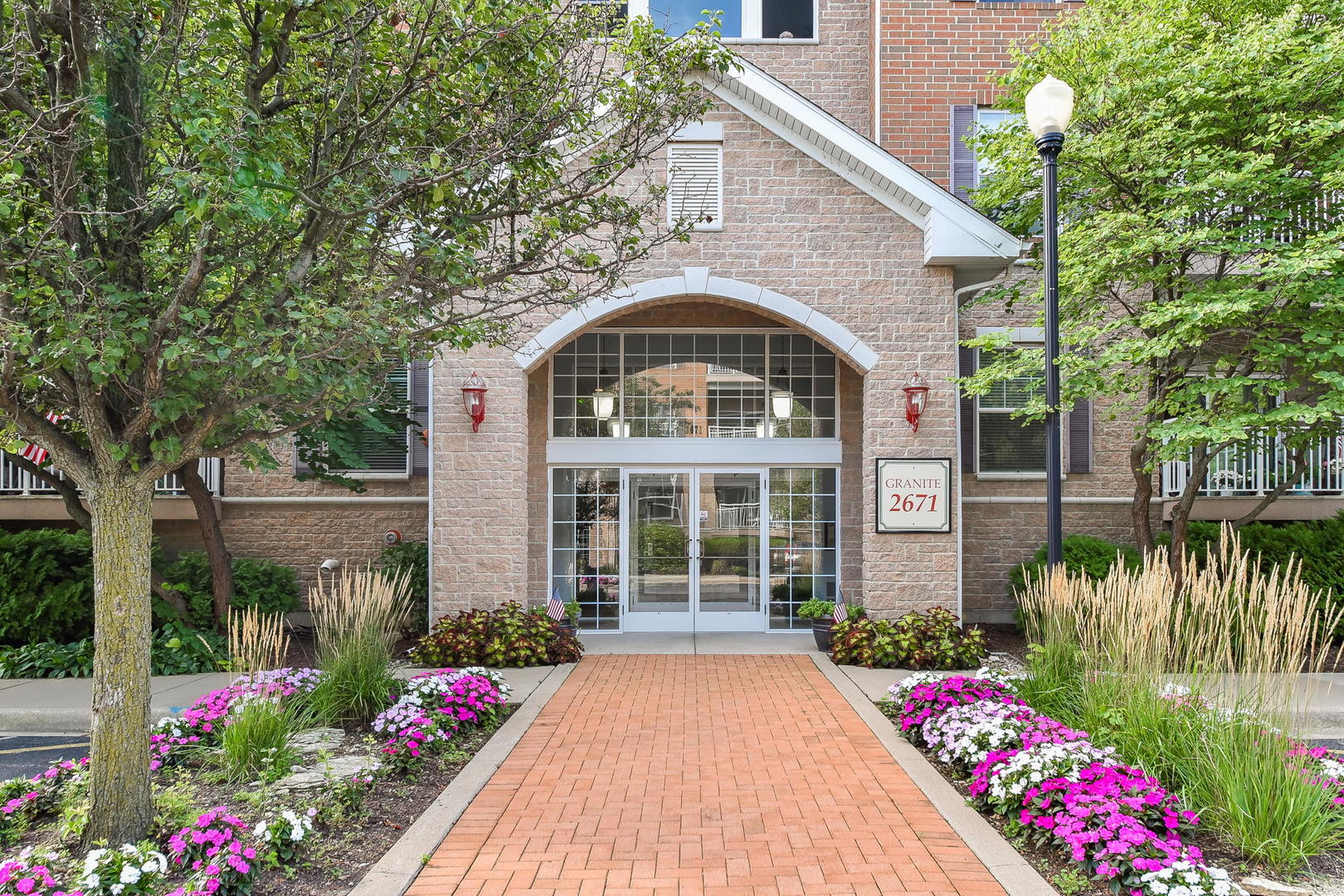 Fantastic first floor unit in Crossings at Geneva, a "55+" community ideally located to appreciate all that Randall Road has to offer. Enjoy your own private deck and open floor plan with loads of natural light. This home offers a fresh palate featuring updated paint, 2 bedrooms, both with plantation shutters, and 2 full baths. The living room includes an area for a dining table. The neutral kitchen features white cabinetry and plenty of counters space. The breakfast bar works for a casual bite and can fit 2-3 bar height chairs. The large primary suite includes a large bath with separate shower and tub, and a walk-in closet. The second bedroom includes custom shelving and desk space so this room can serve many purposes - office, guest room, tv room. In unit laundry too. A private heated garage space and storage area are included in the sale. The close proximity to Delnor Fitness Center and Geneva Commons is ideal. Crossings of Geneva offers a clubhouse for entertaining larger groups, a peaceful courtyard area, plus opportunities to get to know other owners thru social clubs. You can't beat the location and easy living at 2671 Stone Circle.