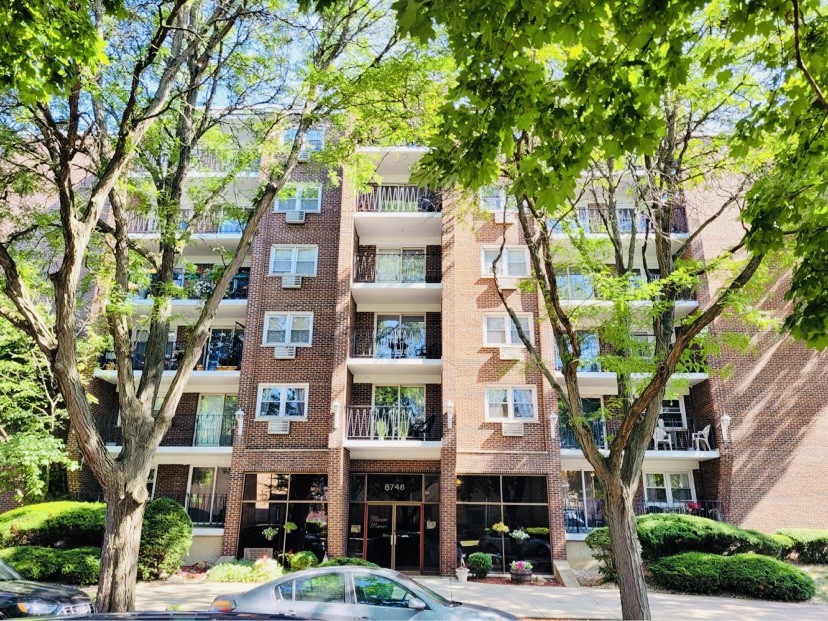 Newly painted and decorated. Brand new wood laminate panel floors, lighting, hardware and vanity in master bathroom. Situated across the street from the Forest Preserve. Corner unit located on the 4th floor provides view of the area. The South - East exposure offers plenty of natural light and makes the place bright and sunny. Spacious, open concept, large size bedrooms, neutral decor. Living room connects with the dining area and the 5 x 17 balcony with the tree top view. Entry hallway and both bedrooms feature abundant closet space. Additional generous storage space in the basement. Elevator building with an elegant foyer. Laundry conveniently located on the same floor next to the apartment. Assigned 1 parking space. Excellent location, close to the Hwy I-90, Blue Line, O'Hare International Airport, shopping and restaurants. HOA fee includes: Heat, Water, Gas, Parking, Insurance, Exterior Maintenance, Lawn Care, Scavenger, Snow Removal. Property taxes do not reflect Homeowner Exemption.