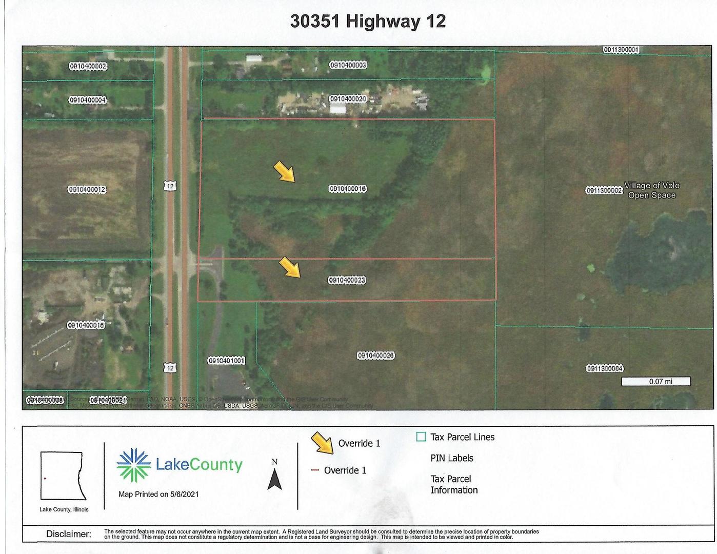 ROUTE 12 LOCATION, 1,841 feet frontage. APPROXIMATELY 22 ACRES. Currently unincorporated Lake County Pin 09-10-400-016 Zoned AG/OS Frontage 1,129.53 frontage. Contiguous to the Village of Volo pin 09-10-400-023 Zoned LI Frontage 711.50 feet. Commercial industrial potential. Curb cut driveway installed. High Traffic Count. Seller will sell subject to zoning change final annexation. Wetland map and soil borings under additional info.