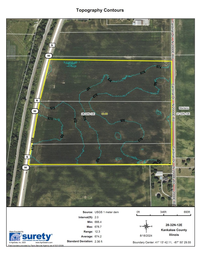 Good road frontage on Rt 50 and also 2000 E --1600+ road frontage- Bring you business and receive tremendous traffic exposure As a farm it has an excellent tenant and soils have a PI of 112.8 The beauty of this property is being North of Manteno Quarry with good frontage on Rt 50 -