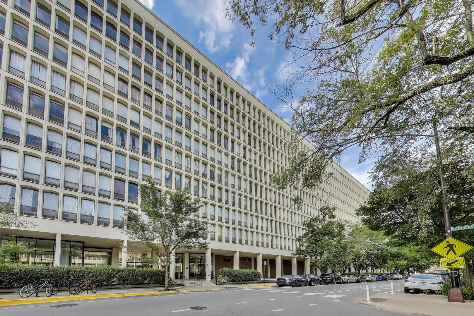 Located just steps from the University of Chicago campus, this corner condo offers beautiful sunset views overlooking mature trees and historic university buildings. Designed by I.M. Pei, the residence showcases his iconic architectural style with distinctive arched windows that flood the home with natural light and seamlessly connect the modernist interior to the open green spaces below. The spacious main living area features wood floors and plenty of room for both living and dining. The well-appointed kitchen includes stainless steel appliances-among them a brand-new stove and refrigerator-along with generous counter space and storage. Both bedrooms have brand-new carpet and are large enough for king- or queen-size beds, as well as a desk or additional furniture. The primary suite includes a full-size tiled shower and the original porcelain sink and faucet, adding a touch of classic character. This pet-friendly building is an excellent option for investors seeking to rent to University of Chicago students or for anyone wanting to live in the heart of Hyde Park. Enjoy close proximity to the lakefront, vibrant nightlife, shopping, dining, and an easy commute to downtown. Residents benefit from attentive on-site management, strong security, and a dedicated engineering staff. Amenities include a lovely pool, fitness room, three garage parking spaces, a storage locker (#192), and an impressive courtyard centered around a beautiful fountain. Monthly assessments cover heat, water, gas, and on-site management. Freshly painted and move-in ready, the condo also features three brand-new air conditioners-offering comfort, convenience, and style in one of Hyde Park's premier buildings.