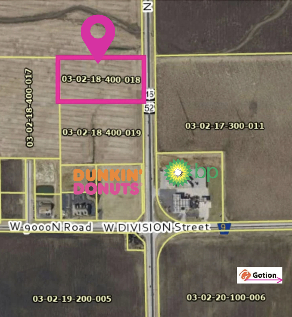 Commercial ready. Total of 5+/- acres. Excellent location with 328' of frontage on US Hwy 45/52. 1 mile west of I-57 at the 322 (Co Hwy 9) interchange in Manteno. Just N of 9000 N intersection. This property has great potential for development being in the middle of future commercial and residential expansion. Next to Dunkin' across from BP and Down the street from the new "Gotion Electric Battery GigaFactory".