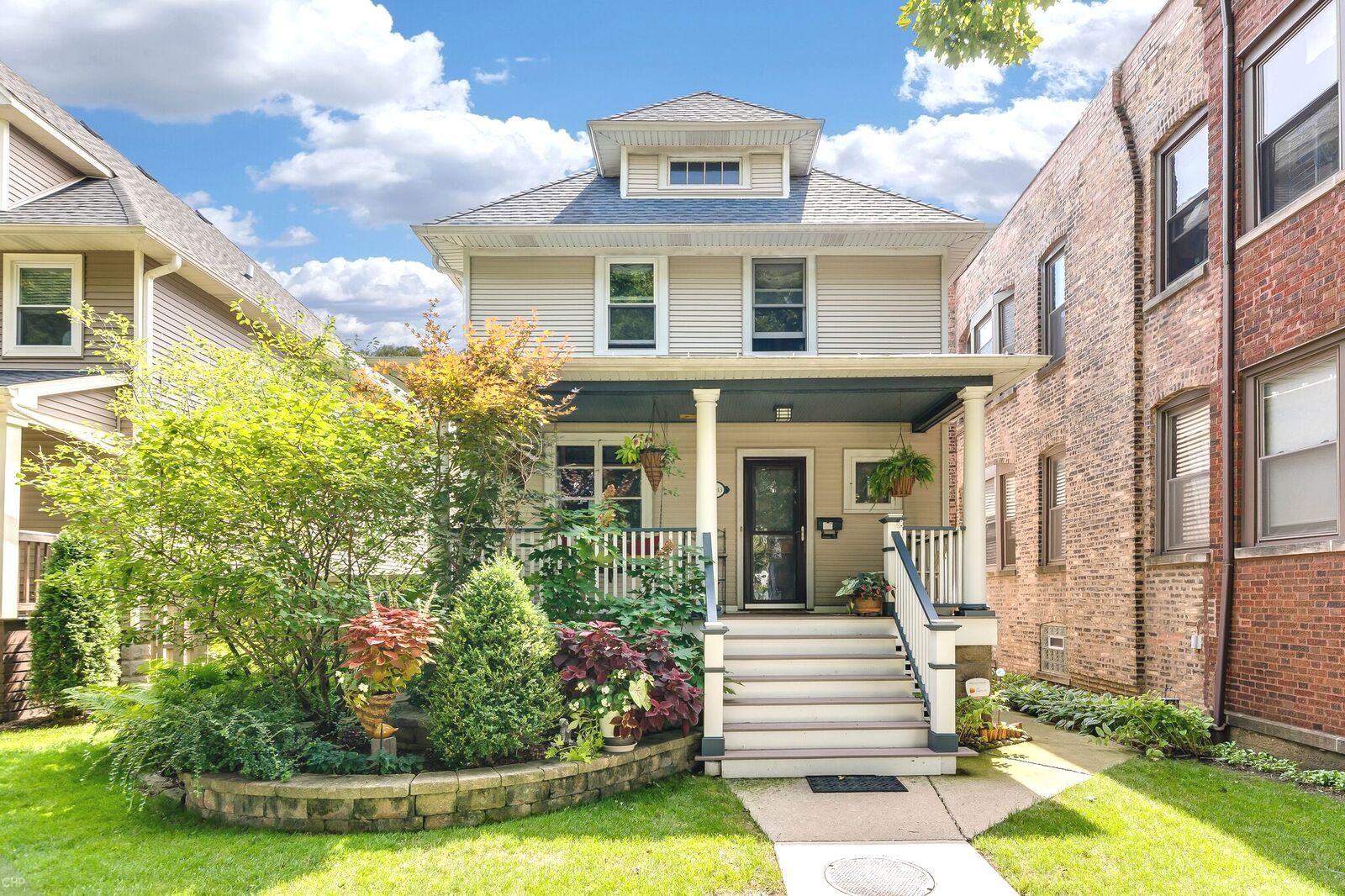 Set on an oversized lot in the highly sought-after Old Irving Park neighborhood, this meticulously maintained historic home offers the ideal blend of vintage character and modern convenience. Owned by the same family for over twenty-five years, this property has been thoughtfully updated throughout with both comfort and entertaining in mind. A welcoming front yard and covered porch with custom seating leads into a warm and inviting main level. The living and dining areas flow seamlessly together and feature beautifully preserved built-ins, rich moldings, and a custom stain glass window. The chef-designed kitchen is both beautiful and highly functional, featuring a custom bar area, prep sink, built-in workstation and a stunning bay window that fills the space with natural light. Directly off the kitchen, a newly constructed Trex deck overlooks a truly exceptional backyard retreat. Professionally designed perennial gardens, raised vegetable and herb beds, custom hardscaping, a pergola with dining area, a handcrafted arbor, and a newly added shed create a functional and serene outdoor space. The upper level includes three generously sized bedrooms, including an updated primary suite with a full bath, walk-in shower, and walk-in closet. The third bedroom has been thoughtfully divided to create an office-ideal for working from home-or could easily serve as a nursery. A finished attic offers abundant additional storage. The fully finished lower level includes a half bath, a spacious laundry room, a walk-in pantry, additional walk-in closet and a flexible fourth bedroom/office/craft room. Centrally located, this home is steps away from restaurants, Smoque BBQ, breweries, Starbucks, Six Corners shopping, and multiple transportation options-including the Blue Line (only 6 stops to Ohare with travel time of 20 minutes), 2 metra stops (1 stop away from Ogilvie and 2 stops away from Union Station) and convenient highway access. This is a rare opportunity in one of Chicago's most charming well-connected neighborhoods.