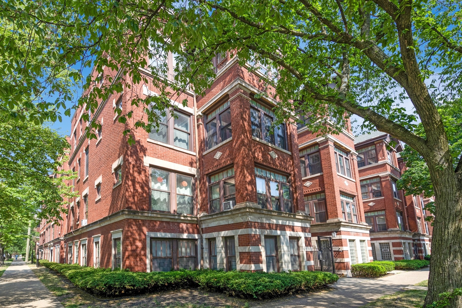 Light streams into the second-floor unit of this condominium, nestled on a quiet one-way street and overlooking the historic Greenwood Avenue Row Houses. The current owners updated this three-bedroom two-bath unit, resulting in a beautiful combination of a modern vibe with vintage details. Entering the foyer one finds the sun-drenched living room, focused on a fireplace surrounded by built-in bookshelves. The adjacent sunroom is lined with windows on three sides, accented by stunning art glass. A central hallway provides access to two bedrooms and a shared bath and continues toward the large dining room. With south facing windows and vintage built-ins, this is a delightful place to gather. The new kitchen offers plenty of cabinetry, stainless steel appliances and a laundry alcove - with access to porch that leads to a lush yard below. An additional bedroom and a second, newly renovated bath are located near the dining room and kitchen. This spacious condo is situated just blocks from the University of Chicago campus and all the amenities of 53rd Street. Come for a visit-you may stay longer than you expected!